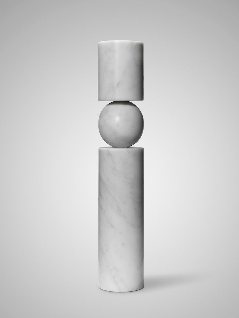 A play on the concept of pivots and supports, Fulcrum is a sculptural and monolithic candlestick whose cylindrical stem appears to balance on a central sphere.