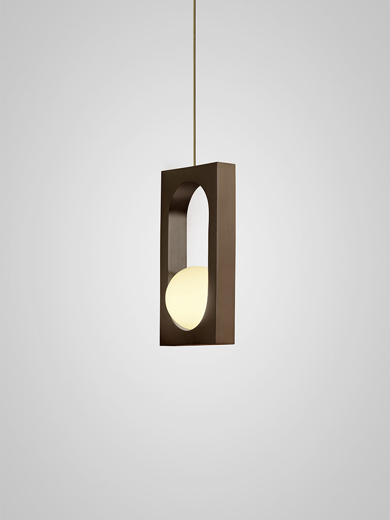 Mythos is a brass pendant light formed of one or two sculptural interconnected links capturing an illuminated glass orb. Mythos Duo is suspended from a hand-stitched leather strap which acts as a sling for the links, concealed connections make it almost impossible to determine how the orb generates its illumination. Mythos is also available as a single pendant suspended by a cord.