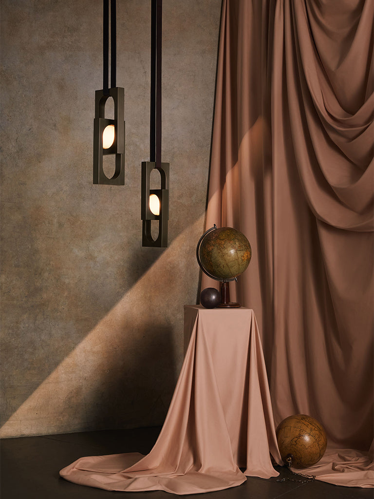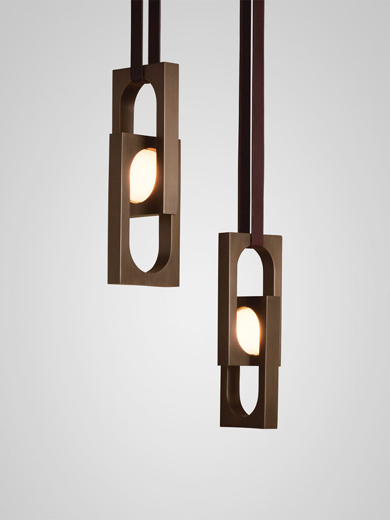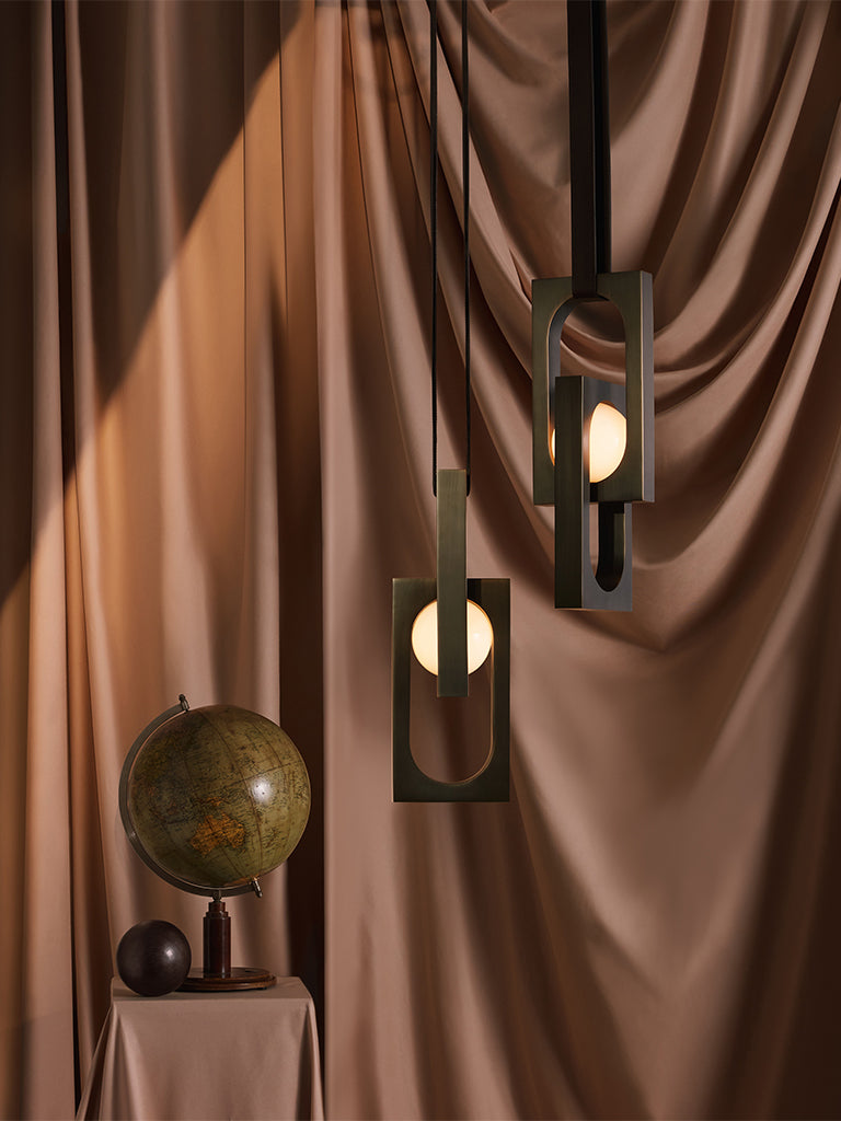 Mythos is a brass pendant light formed of one or two sculptural interconnected links capturing an illuminated glass orb. Mythos Duo is suspended from a hand-stitched leather strap which acts as a sling for the links, concealed connections make it almost impossible to determine how the orb generates its illumination. Mythos is also available as a single pendant suspended by a cord.