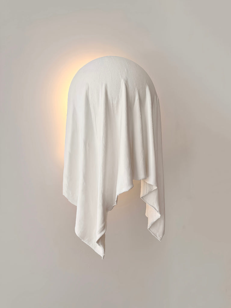 Requiem Wall Light is an ethereal wall mounted light fixture sculpted by hand in our London factory. The piece takes inspiration from the marble drapery on ancient statues and sepulchral sculptures. Each light appears weightless and fluid but is solid in form made by hand-draping fabric and plaster which is illuminated from behind resulting in a halo effect that is both elegant and ethereal. These ghostly forms are then sculpted with more plaster into their final shape and set until solid. The effect is one of fragile drapery that appears to float and illuminate. Unlike the rest of the Requiem Collection of pendant sculptures, The Requiem Wall Light is not a limited edition piece, however due to it’s hand crafted nature, each one is unique.