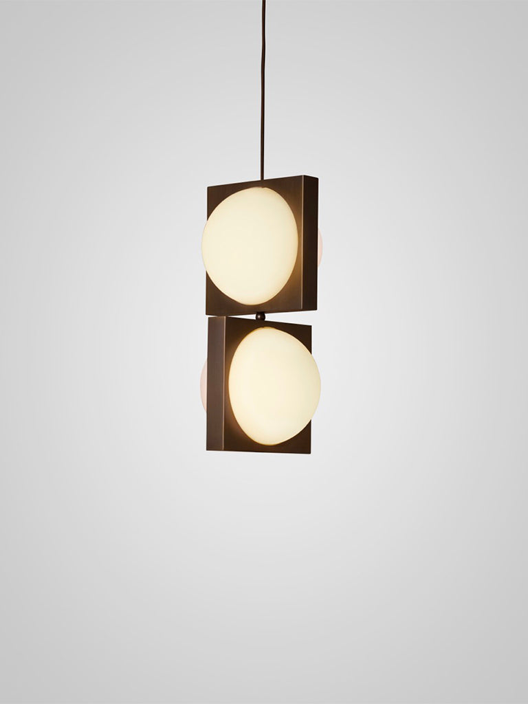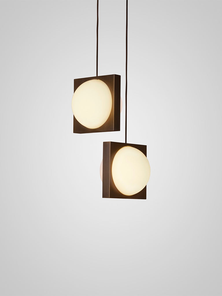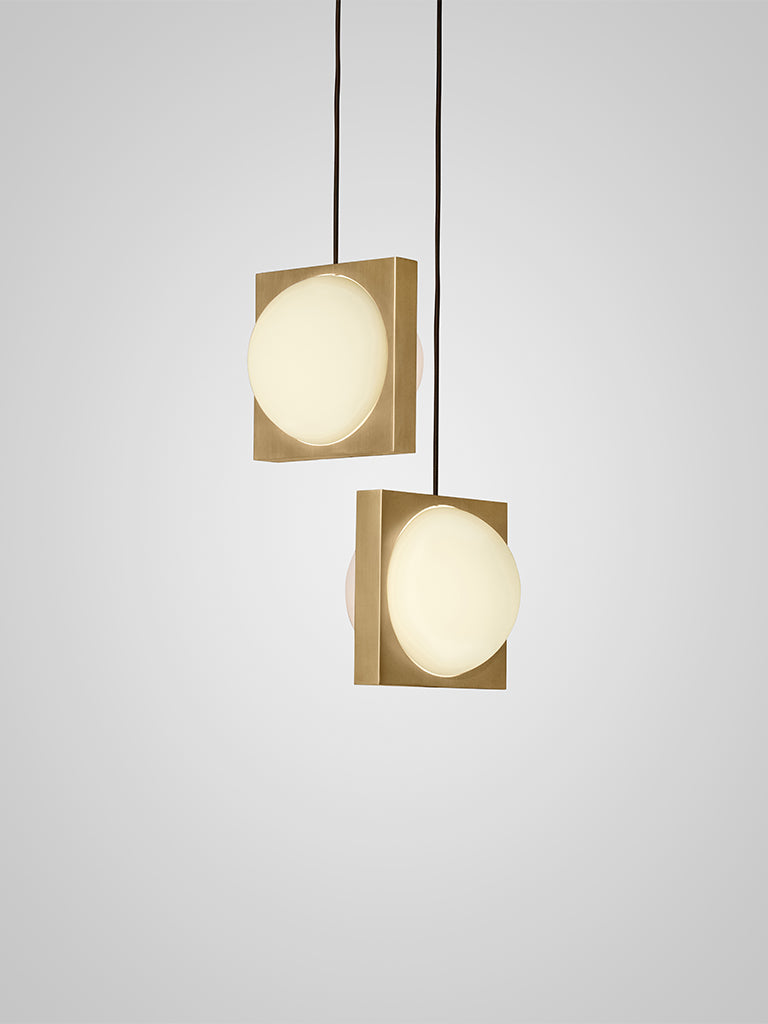Solstice references the prehistoric monument Stonehenge and its spiritual rituals around the Summer and Winter Solstices. The illuminated opaque glass globe of Solstice alludes to the sun, and the square brass structure which encases the globe references the monolithic form of the stone. Taking cues from 1960s lighting design, Sostice is where mid-century meets midsummer.