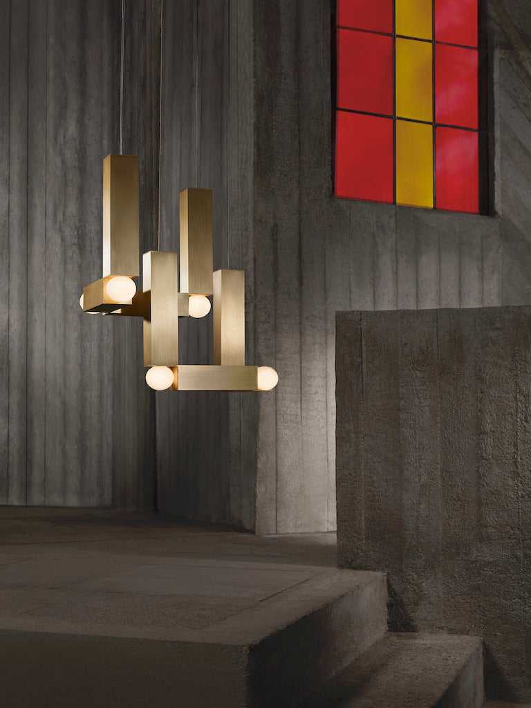 Vesper is inspired by the simple geometric lines of Brutalist sculpture and modernist cathedral lighting. Formed with extruded aluminium and available in anodized gold or silver, Vesper explores the delicate balance and interconnection of its rectangular cubes that are seamlessly connected by illuminated spheres. The light sculpture, which is suspended by cables, is available in both Duo and Quattro versions.