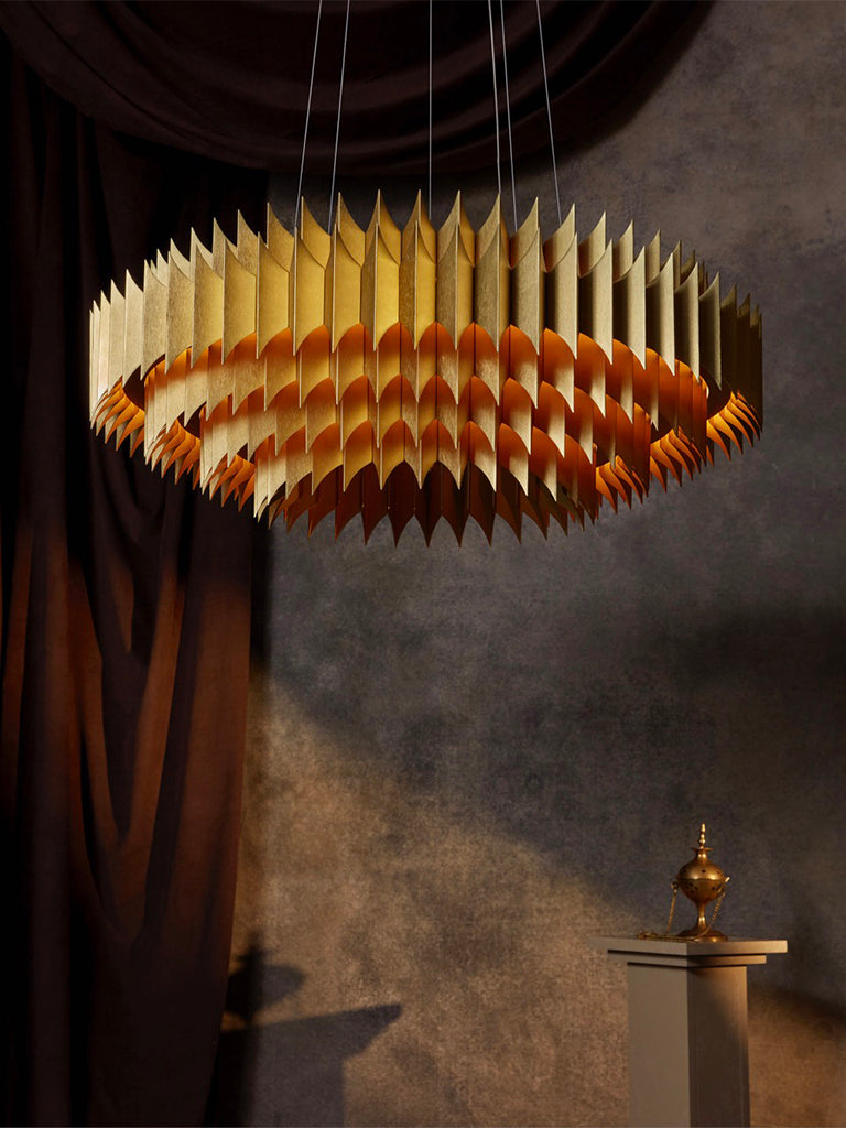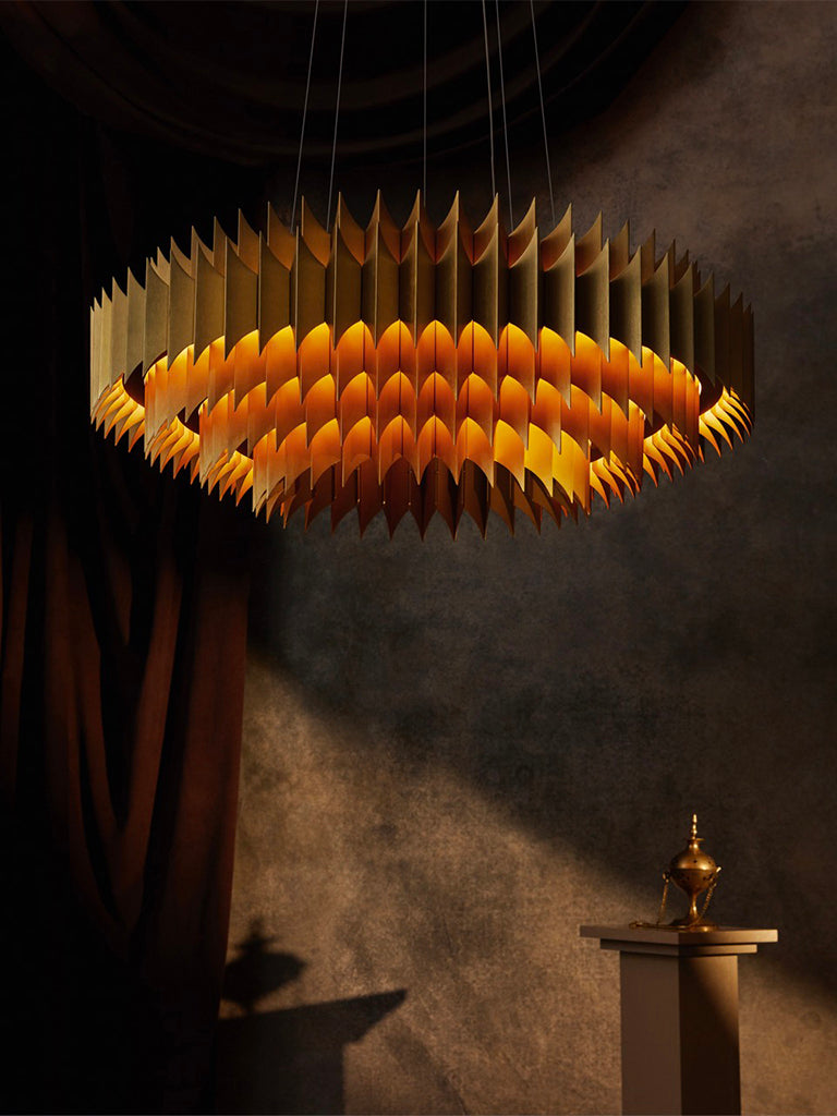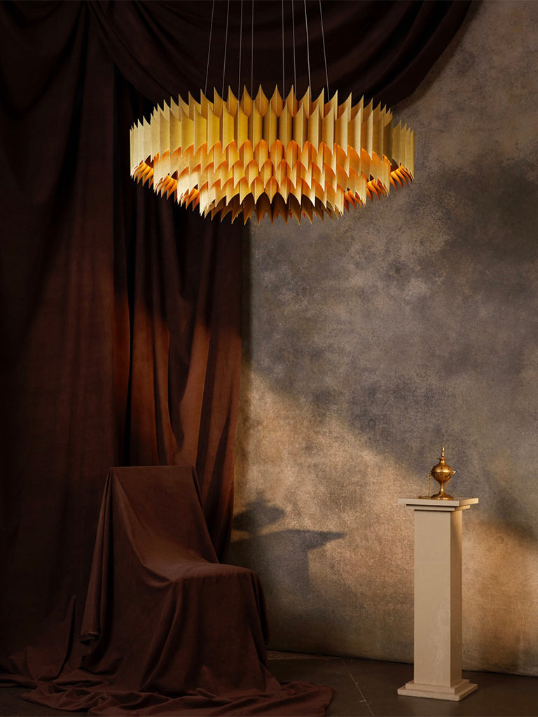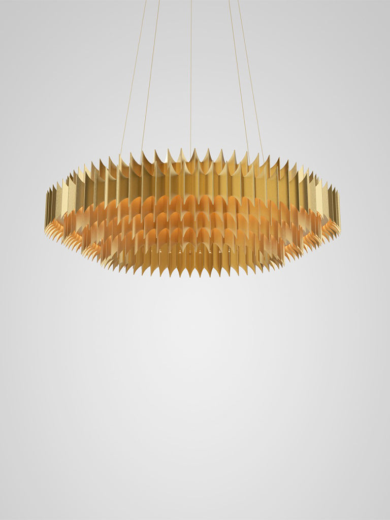 King is a majestic chandelier of significant proportions which intersects the boundaries of art and design. King is formed of individual brushed metal leaves which have been folded, tapered and brushed by hand to create multiple tiered rings, each concealing a hidden illuminated glow which envelopes the golden leaves, casting shadows and light. A sculpture in its own right, King was originally envisioned around the character of the King of Salem in ‘The Alchemist’ book and the legend of King Arthur, hence its crown-like appearance. Its medieval characteristics have been fused with a semblance of brutalism, which makes King striking when dimmed and resplendent when illuminated.