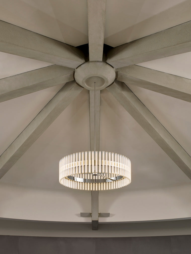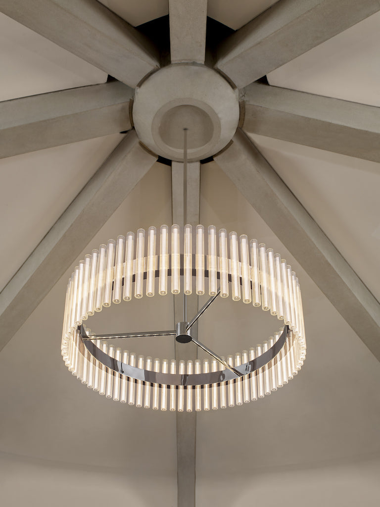 A chandelier of multiple adaptations which projects layers of ethereal rings of light created from linear LED light bulbs. Created and produced by Lee Broom, the hand blown glass bulbs contain a perpendicular LED filament which refracts against the vertical lines of the reeded glass. En masse and reflecting in the rings, the overall effect ensues a glowing aura.
