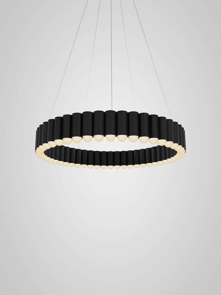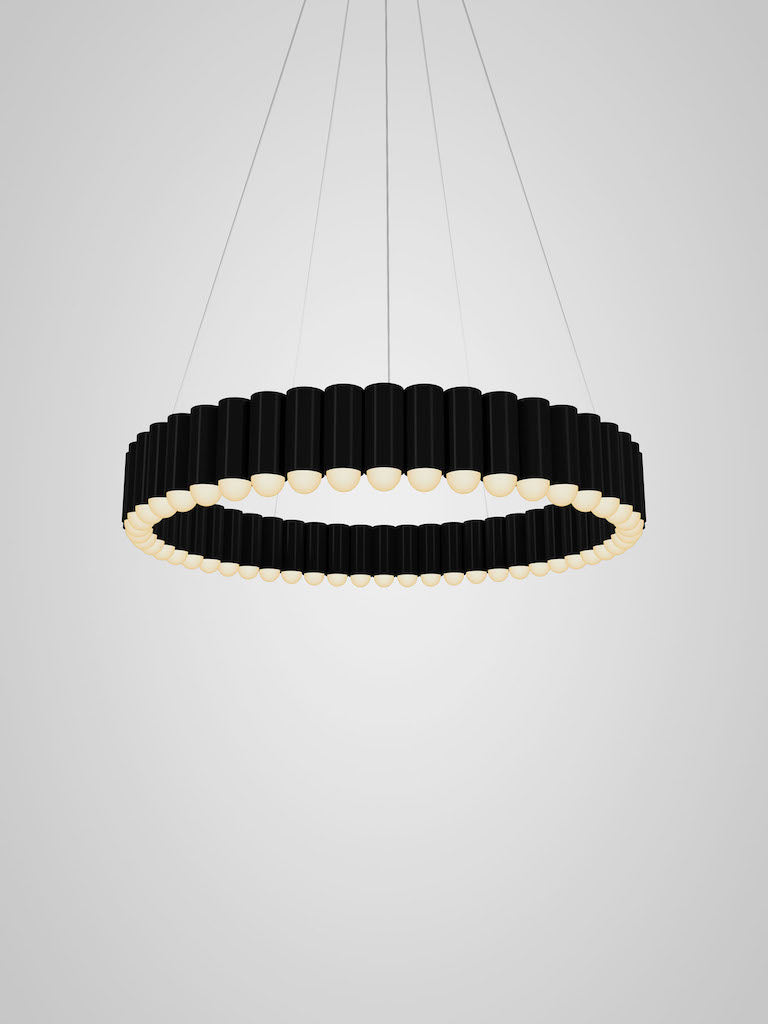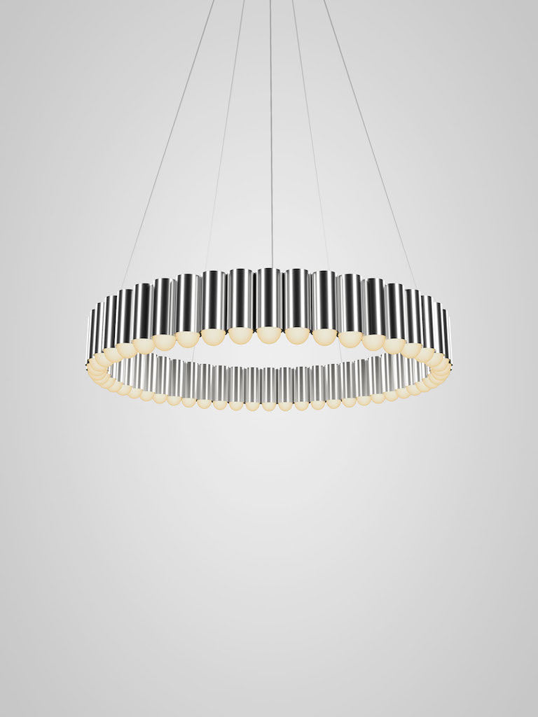 Inspired by the merry-go-round ride of a traditional British fairground, Carousel is a pendant light with a heavyweight presence that floats gently in space. Cylinders of gold, chrome, gunmetal or black each house an inset LED lighting element resulting in a spectacular yet playful ring of light. Carousel is available in 4 sizes, Small, Medium, Large and XL each suspended from a matching finish circular ceiling plate by steel suspension wires with a single clear cable.