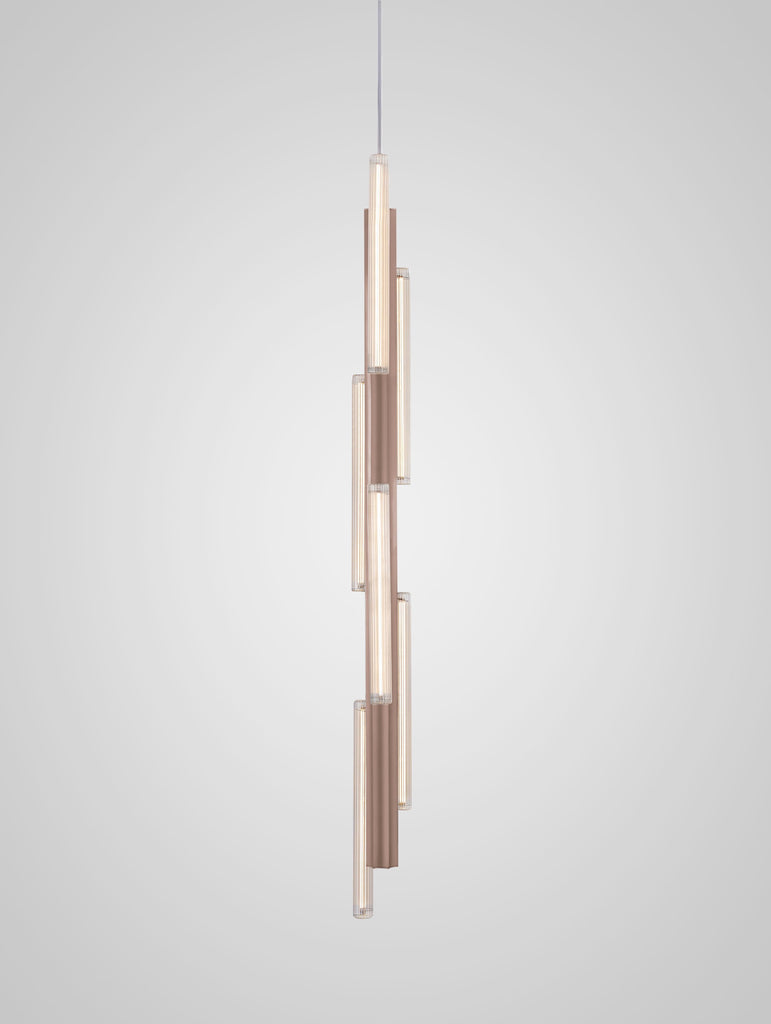 Hail is inspired by the shards of light and shadow often experienced from lancet windows in vast church arches. Available in three options - 3 Short, 3 Tall, 6 Tall - in a gold, bronze or silver brushed finish, Hail has an elongated fluted form fabricated in aluminium with asymmetrically positioned reeded glass lightbulbs placed along its structure. The lights can also be connected to create unique longer customisable configurations up to 15 feet / 4 metres in length.  Longer options are also possible.